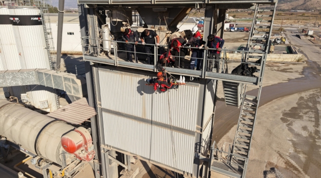 Kahramanmaraş Büyükşehir Belediyesi, personellerin mesleki donanımını güçlendirmek ve acil durumlarda müdahale kapasitesini en üst seviyeye taşımak amacıyla sürdürdüğü hizmet içi eğitimlerine bir yenisini daha ekledi. İtfaiye ve Afet İşleri Dairesi Başkanlığı, AKBEL ve İl Sağlık Müdürlüğü iş birliğiyle Asfalt Üretim Tesisi’nde oldukça kapsamlı ve gerçeğini aratmayan bir tatbikat gerçekleştirildi. Senaryo gereği üretim tesisinde çalışma esnasında fenalaşarak baygınlık geçiren personele İtfaiye erlerince dakikalar içerisinde müdahale edildi. Bilinci kapalı personel yaklaşık 10 metre yükseklikten halatlar yardımıyla güvenli bir şekilde aşağı indirildi. Baygınlık geçiren personel zeminde hazır bulunan İl Sağlık Müdürlüğü ekiplerine teslim edilerek tıbbi değerlendirmeye alındı. Sağlık ekipleri, olay senaryosu çerçevesinde gerekli ilk yardım ve stabilizasyon çalışmalarını uyguladı. Böylece tatbikatın hem kurtarma hem de sağlık entegrasyonu kusursuz şekilde tamamlandı.