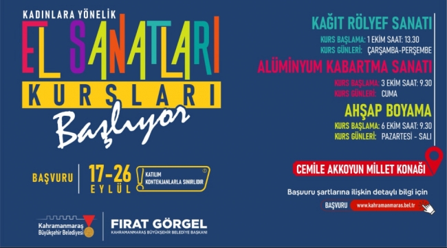 Kurslara katılmak isteyen kadınlar, https://kahramanmaras.bel.tr/form/el-sanatlari-kurslari-basvuru-formu-24130 internet adresinden başvurularını çevrimiçi olarak gerçekleştirebilecek. Başvurular 26 Eylül Cuma günü sona erecek.