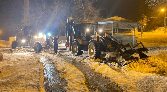Karla mücadele ekipleri, iş makineleri ve tuzlama araçlarıyla zorlu doğa koşullarına rağmen vatandaşların güvenliği için 7/24 görev yaparken, kapanan ara sokakları açmak için gece gündüz demeden çalışmalarına devam ediyor.