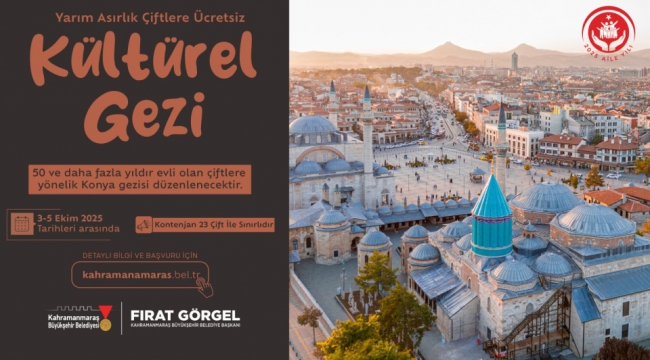 Büyükşehir Belediyesi, 2025 Aile Yılı kapsamında 50 ve üzeri yıldır evliliklerini sürdüren 23 çifti Konya’ya kültür gezisine götürecek. Ücretsiz olarak düzenlenecek geziye başvurular Büyükşehir’in internet adresinden çevrimiçi yapılabiliyor.